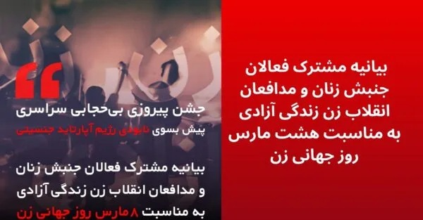 بیانیه ها کارزارها مطالب مقالات و مطالب هشت مارس روز جهانی زن همه ویژه مارس 8, 2025 نسخه تصویری بیانیه مشترک فعالان جنبش زنان و مدافعان انقلاب زن زندگی آزادی به مناسبت هشت مارس روز جهانی زنجشن پیروزی بیحجابی سراسریپیش بسوی نابودی رژیم آپارتاید جنسیتی Previous Post ویژهبرنامه تلویزیونی هشت مارس روز جهانی زن ۱۴۰۳ – ۲۰۲۵ Next Post فعالیتهای میدانی در خارج کشور به مناسبت هشت مارس روز جهانی زن ۲۰۲۵