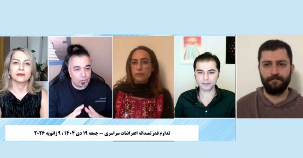 سخنرانی ها مصاحبه، روایت و گزارش مطالب همه ژانویه 9, 2026 وضعیت سیستان و بلوچستان و نقش زنان – فریبا برهانزهی و شیرین شمس ضرورت پیوستن استانهایی چون کردستان و سیستان و بلوچستان به اعتراضات و سراسری شدن جغرافیایی اعتراضات – کیان آذر ضرورت تشکیل آلترناتیو جمعی برای رهبری انقلاب متشکل از نیروهای سیاسی متعهد به زن زندگی آزادی – کیوان صمدی، شیرین شمس، کیان آذر آیا در شرایط کنونی باید به رضا پهلوی تقابل کرد؟ – میثم عتیق، کیوان صمدی، شیرین شمس و کیان آذر Previous Post برنامه تلویزیونی انقلاب زنانه؛ ارزیابی سیاسی در پنجمین روز اعتراضات سراسری و اقدامات لازم پیش رو Next Post لایو شبانه: ایران غرق انقلاب است؛ شنبه ۲۰ دی ۱۴۰۴